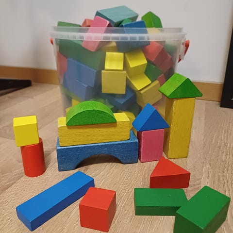 Puisia Eichhorn rakennuspalikoita, noin 106 kappaletta. Palikoissa on vähän käytön jälkeä, mutta ovat hyvässä kunnossa. Yksi palikoista on kärsinyt päädystä (kuva 3).