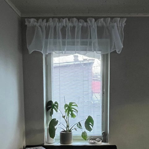 Hyvässä kunnossa oleva verhokappa. Tankokuja 4,5cm. Teetetty Eurokankaassa.