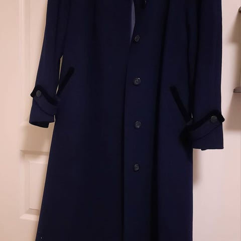 Suomessa valmistettu Lacoda-merkkinen pitkä kaunis villakangastakki. Väri on syvä tumman viininpunainen. Sisältää villaa ja kashmirvilla (cashmere).