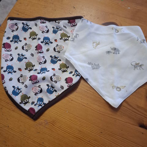 6 kpl vauvan hyväkuntoisia kuolaliinoja kaulaan. Takana tarrakiinnitys. Joissakin on jälkiä soseruuasta vaikka liinat on pesty.