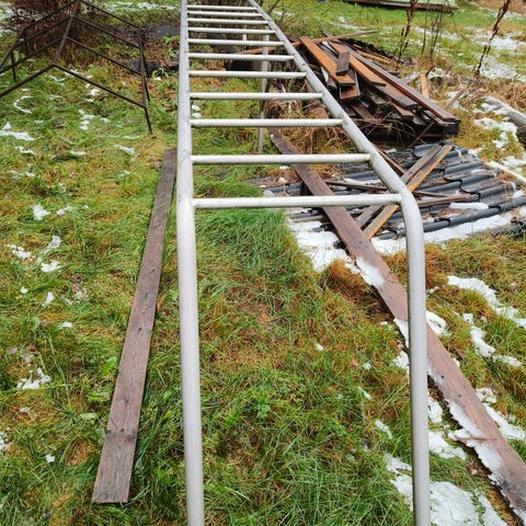 Alumiininen teline/tikkaat, varustettu pyörillä ja tukevilla askelmilla. Soveltuu sisä- ja ulkokäyttöön, tarjoaa turvallisen alustan työskentelyyn korkealla. Kevyt materiaali helpottaa siirtämistä ja säilytystä.