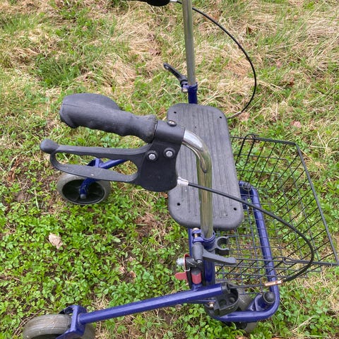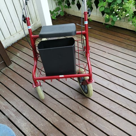 Kronberg Leber AB Royal Rollator on kävelytuki, jossa on musta istuinosa ja punaiset tukirungot. Rollatorissa on neljä pyörää, joista kaksi etupyörää on suurempia ja takapyörät pienemmät. Rollatorin runko on valmistettu metallista ja siinä on kahvat, jotka tarjoavat tukea kävelyyn. Malli soveltuu käytettäväksi sisällä ja ulkona.