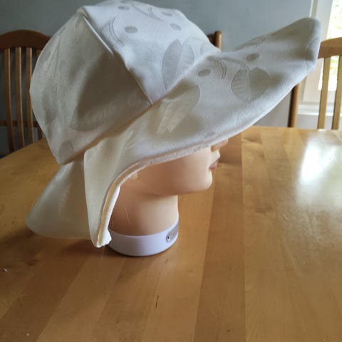 Puuvillainen vuorellinen hattu. Koko 62 cm. Leirin leveys 7,5 cm.