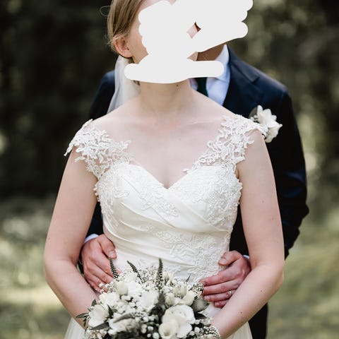 Teetetty hääpukuliikkeessä Helsingissä. Morsiamen pituus 165 cm. Kangas tukevaa, "pellava kangasta" muistuttavaa ja kauniisti laskeutuvaa. Sisäpuoli vuoritettu. Kaunis pitsi edessä ja takana sekä hihansuissa ja helmassa. Viistosti alaspäin levenevä malli. Hääpuvun kokonaispituus noin 140 cm, rinnan ympärys noin 76 cm, vyötärö noin 90 cm, hihan pituus noin 52 cm, helman leveys alhaalla noin 150 cm ja pitsi 10 cm. Helmassa pieni vara lisätä pituutta.