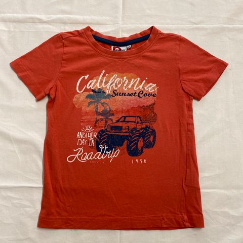 Punaoranssi vähän pidetty lasten T-paita koossa 110cm. Materiaali 100% puuvillaa. Sopii pojille. Paita sisältää painokuvion, jossa on auto ja teksti 'California Sunset Cove' sekä muita yksityiskohtia.