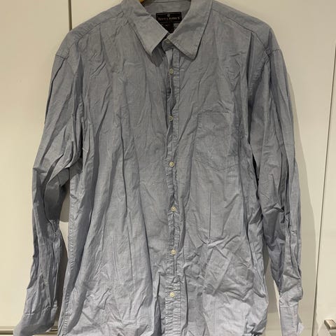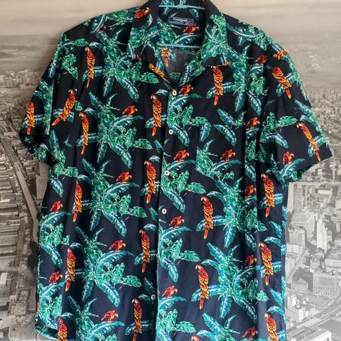 Papukaijan kuvilla koristeltu sinertävä kauluspaita.
