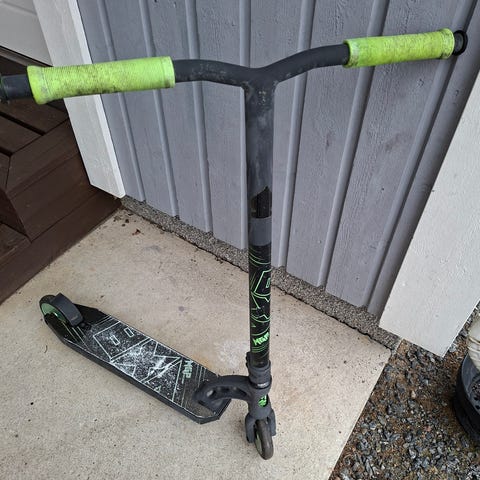 Thrasher skateboard, musta värinen, valmistettu puusta. Tässä skeittilaudassa on käytön jälkiä, mutta se on kokonaisuudessaan ehjä ja käyttökelpoinen. Pyörät ja laakerit ovat kiinnitettynä alumiinisilla truckeilla.