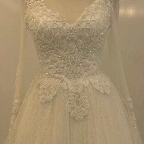 Myydään luonnonvalkoinen kauniisti laskeutuva hääpuku. Helma kuvassa rypyssä säilytyksen vuoksi.
