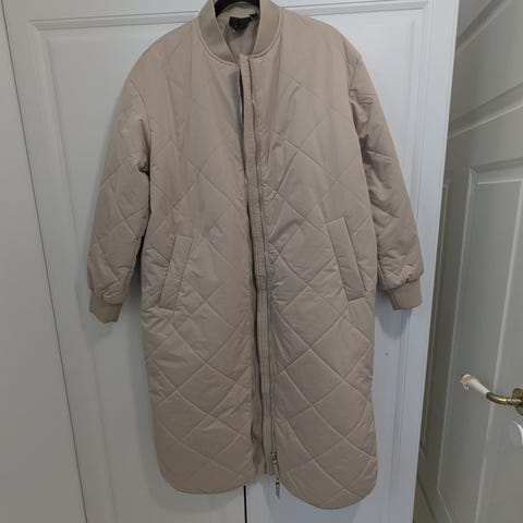 Vero Moda pitkä takki naisten XS-koko, sininen väri. Takissa on vetoketju ja kiristysnyöri vyötäröllä. Takissa on huppu, jonka reunassa on tekoturkis.