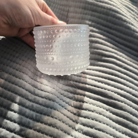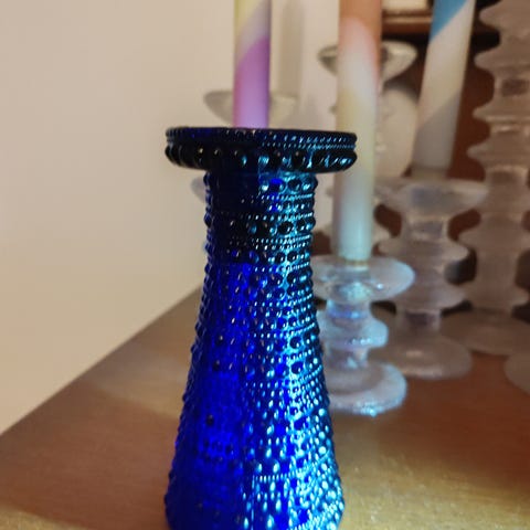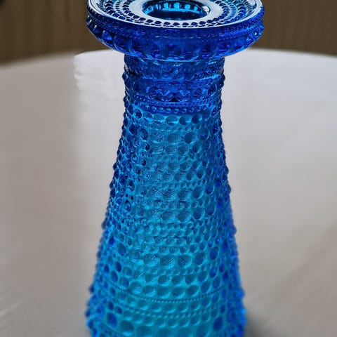 Oiva Toikan suunnittelema, v. 1964-1988. Korkeus 15cm. Väri turkoosi. Käy sekä kynttilänjalkana että pienenä maljakkona kun kääntää ylösalaisin.