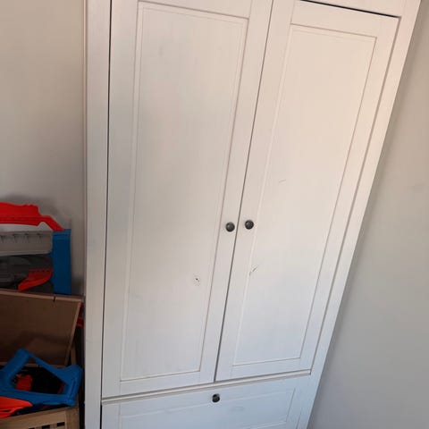 Lasten kaappisetti, antiikkivärinen vaaleanpunainen. Kaapin mitat ovat noin 45x22 x 20 cm3. Keskimmäisessä on peili. Kaappi leluille. Alapuolella olevan pöydän koko on 80x24 x 41 cm3. Hyvin vähän käytetty. Kahdessa kaapissa on hyllyt. Vain nouto.