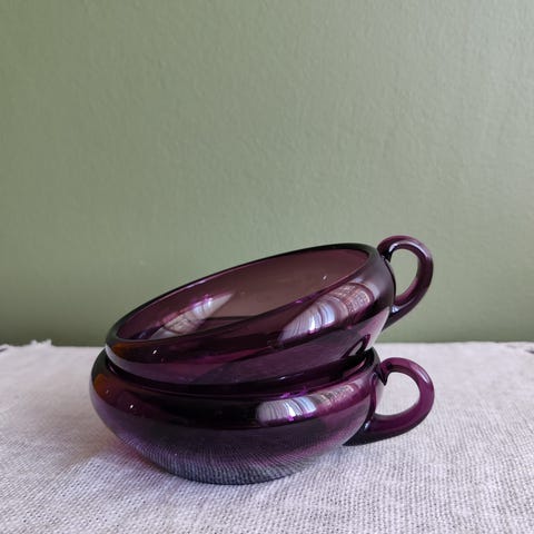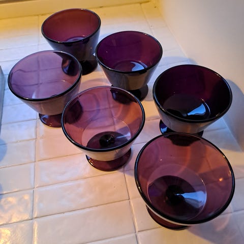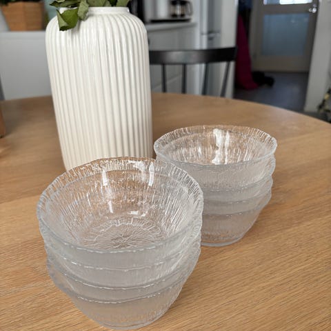 Iittala / Sirkku-Liisa Kumela lasiset jälkiruokakulhot, väri violetti. Setti sisältää kuusi kappaletta. Kulhot ovat valmistettu lasista ja sopivat jälkiruokien tarjoiluun. Kunto erinomainen. Säilytetty kaapissa käyttöä odottamassa. Koko sarja 6 kpl maksaa 39 euroa. Voin lähettää. Mmm.