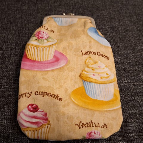 Kangaskukkaro tuplalukolla, lukon lev. 8 cm ja pussukka syvyys 13,5 cm ja pohjan lev. 12 cm. Koiratalous.