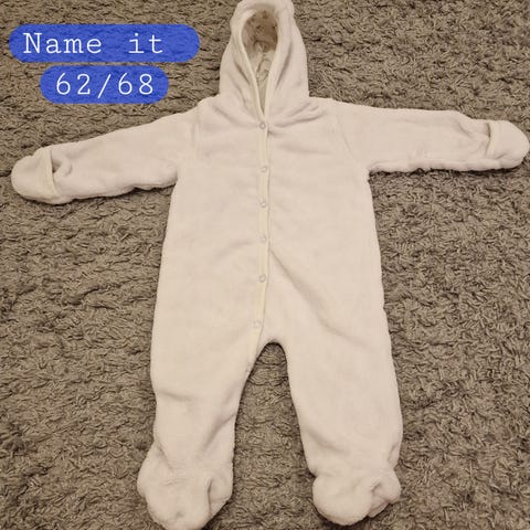 Baby gap newborn (3 - 6 kk) lämmin teddykarvainen pukusetti, jossa housut ja huppari erikseen. Supersöpöt jalkapohjat, joissa tassunjälki. En löydä moitittavaa kunnossa. Meillä jäi lähes kokonaan käyttämättä.