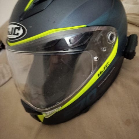 HJC rhpa 12 Musta Moottoripyöräkypärä, koko L + cardo freecom 4x. Kypärä on kiiltävän musta ja suunniteltu moottoripyöräilyyn.