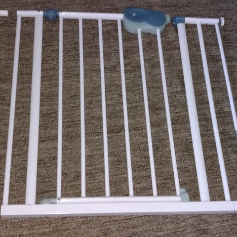 Lundbergs Trofast -portti kahdella jatkopalalla. Tukeva ja turvallinen. Esitteen mukaan tämä kahden jatkopalan portti sopii 860-935 mm aukkoon.