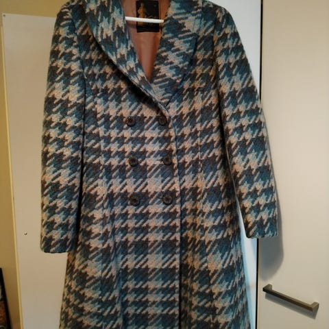 Hyväkuntoinen, siisti vintage villakangastakki, eläinkuvioinen turkisvuori ja kaulus luultavasti kultalammasta. Hihansuiden sisäpuolella resorit, joilla voi tarvittaessa pidentää hihoja.