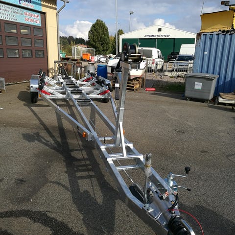 Sinkitetty veneteline, jossa on useita sinisiä rullia venekuljetukseen ja säilytykseen. Teline on pitkä ja soveltuu erikokoisille veneille. Rullat helpottavat veneen liikutusta ja asettelua telineelle. 16m max 800kg