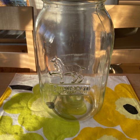 Riihimäen apila 5l sinertävän värinen lasipurkki. Kunto vaikuttaisi olevan ok, kansi ehjä.