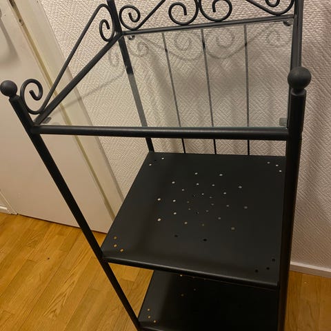 Musta metallinen seinähylly esim. kylpyhuoneeseen. Kolme lasihyllyä ja pyyhekoukut.