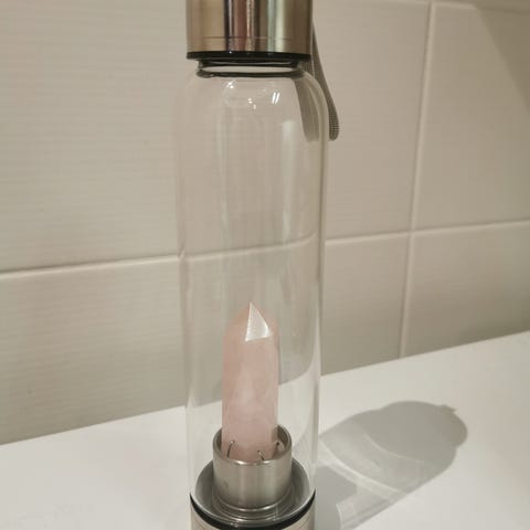 Ametisti vuori- kristalli-vesipullo, juomapullo, 0,5-0,55l. Kuumuutta kestävä lasilaatu ja ylä- ja alaosa terästä. Lasiosa kestää konepesun. Ametistikristalli auttaa unen laatua, fyysistä ja henkistä hyvinvointia.