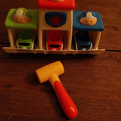 Vasara ja naulataulu -setti. Paljon erilaisia kulkuneuvoja; työkoneet, poliisi- ja paloautot, henkilöautot. Mukana myös liikennemerkkejä ym. Ikäsuositus 3+ Siisti kunto.