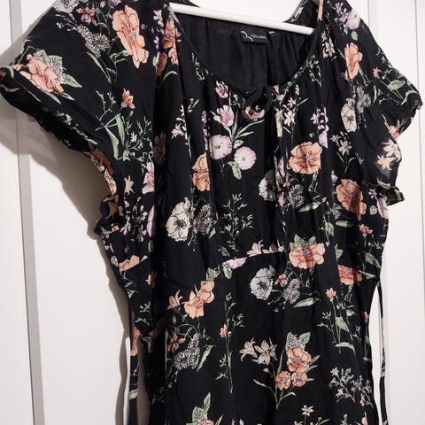 Kuvien mukainen pirteä ruutukuosinen puuvillamekko reippailla taskuilla ja kivalla leikkauksella, helma on epätasainen. Kai-kai 57 cm ja olka-helma 97 cm.