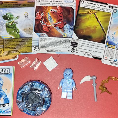 Kaikki osat tallella, minifiguuri ehjä, ei halkeamia mutta jonkinverran pieniä kolhuja / kulumia, ei sisällä kortteja