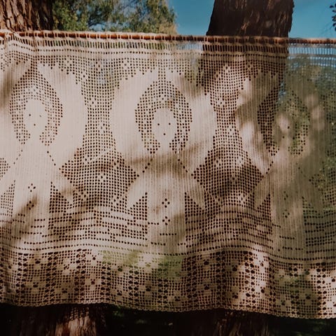 Luonnonvalkoisesta kalalangasta käsinvirkattu verho. Sopii myös päiväpeitteeksi. Pesty ja silitetty.