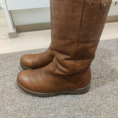 Konjakin ruskeat Panama Jack talvisaapikkaat. Paksu lämmin vuori. Vartta mahdollisuus pitää taitettuna tai pystyssä. Ei vetoketjua, kenkä vedettävä jalkaan. On napakka ja pysyy hyvin jalassa. Normaalia pientä käytönjälkeä kärjissä, yleisilmeeltään todella siistit.