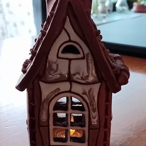 Myydään kuvien keraaminen piparkakkutalo/ -lyhty / talolyhty / tuikkulyhty.