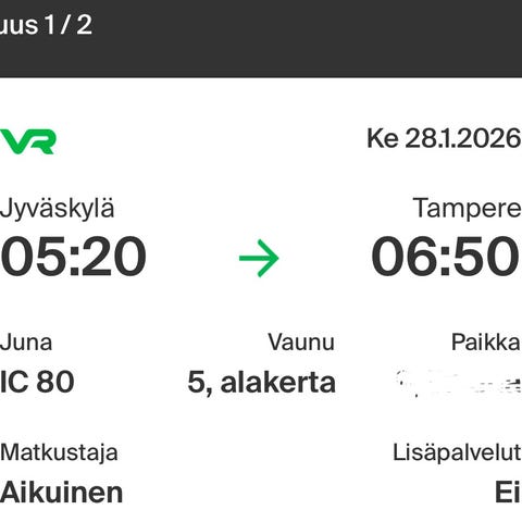 Myydään junalippu. Vaihto Tampereella, joten voi käyttää myös vain osaan matkasta.