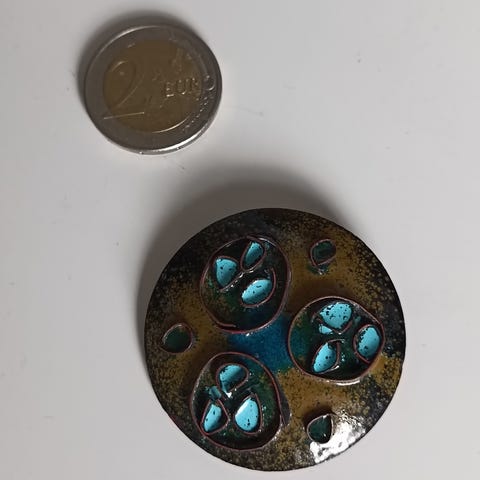 1960-luvun rintakoru (E. Kauppi?) Koko 5 x 2,2 cm. Tarkkasilmäinen tunnistaa leimat korun takaa.