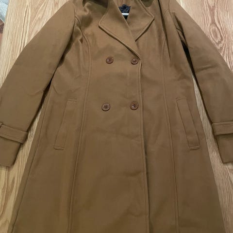 Beige ulkotakki. Neppari - ja vetoketjukiinnitys. Irrotettava huppu, pystykaulus, takana halkio. Mahdollisuus säätää sekä helmaa että vyötäröä