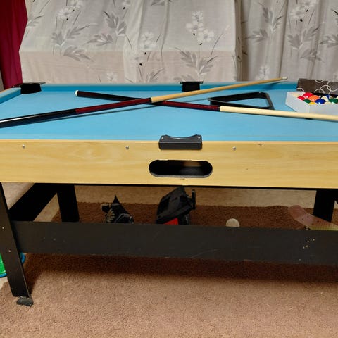 Vähän käytetty biljardipöytä kaikki pallot on ja mailat mukaan ja mukaan tulee myös pingis, jalkapallo ja ilmakiekko