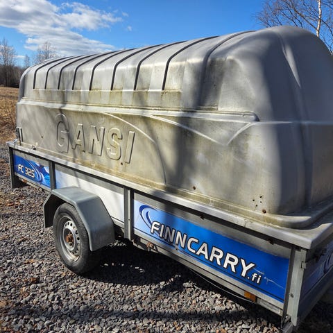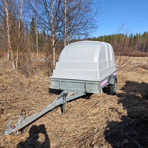 Siisti ja käytännöllinen kuomuperäkärry. Kevyt alumiinirunko kippitoiminnolla ja jämerä lasikuitukuomu.