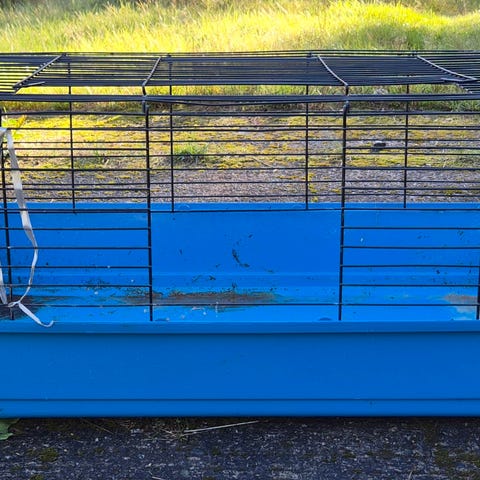 Metallinen kaninhäkki, jossa sininen muovipohja. Häkki on kooltaan 100x53x46cm ja soveltuu pienille jyrsijöille tai kaneille. Häkissä on metalliverkko, joka tarjoaa ilmanvaihtoa ja näkyvyyttä. Soveltuu sisäkäyttöön lemmikkieläinten pidossa.