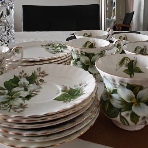 Kuin uusi englantilainen kahviastiasto, osassa kuppeja pohjassa käsin maalattu kultakirjaimin 908N. Täysi setti: 6 kahvikuppia, 6 tassia ja 6 leipälautasta, halkaisija 15,5cm. Ei kulumia eikä virheitä. Vain nouto.