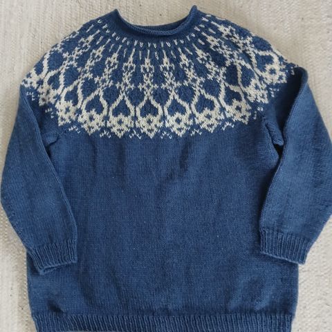 Farkunsinisestä Novitan Moomin-langasta kudottu Strömsö-pusero kokoa XS-S. Langassa 75 % villaa ja 25 % polyamidia. Korkeus olkapäältä 56 cm, leveys 38 cm ja hihan pituus kainalosta 39 cm.