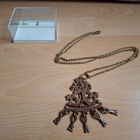 Kalevalan kaulakoru valmistettu pronssista. Ketjun pituus 60 cm ja Koru korkeus 8 cm ja leveys leveimmillään 5 cm.