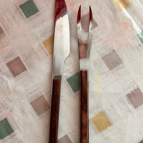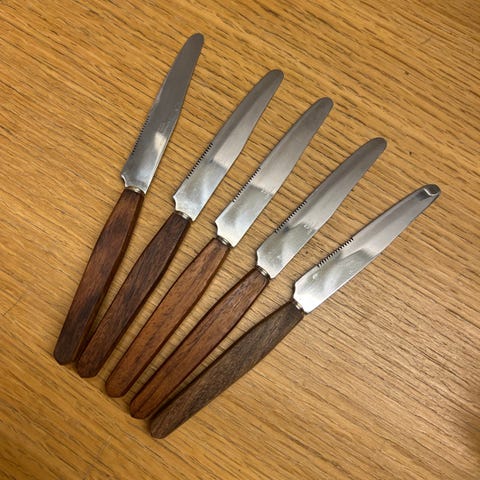 Myydään kuvan yksittäinen puuvartinen ruokailuveitsi.