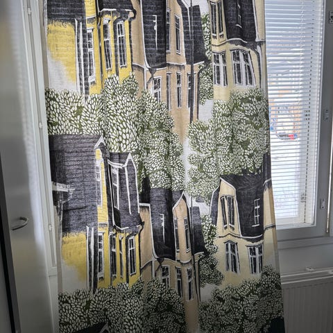 Hyväkuntoinen, tehdasmittainen Vallilan Punkaharju verho. Kuvassa haalea väri johtuu ikkunan valoheijastumasta.