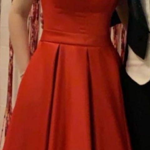 Tyylikäs vanhojentanssipuku tai muu juhlapuku. Yläosassa punostettua kuosia sekä koristekuvio. Yläosassa sisään rakennettu poven tuki. Helmaosassa tylliä leveyttä tuomassa. Vetoketju sivussa. Mukana myös ohut huivi ja käyttämätön pukuun kuuluva bolero.