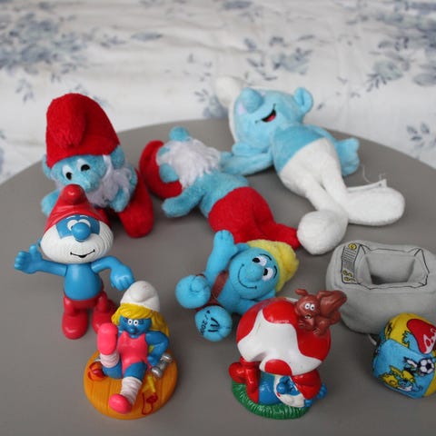 Hyväkuntoiset ja siistit smurffit vuodelta 2011. Pituus noin 24cm. Sekä vanhempi smurffivauva. Vauvan röyhelössä vähän tahraa, muuten siisti.