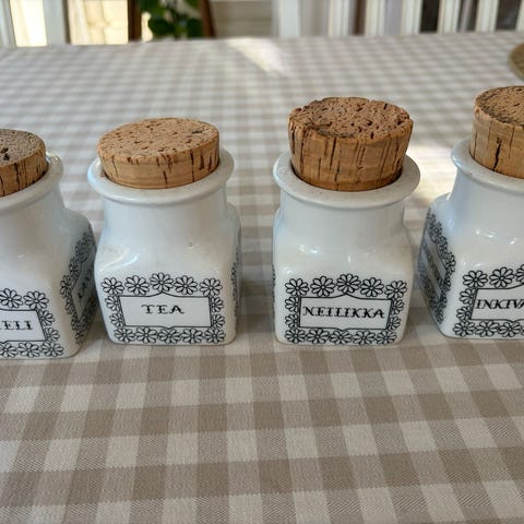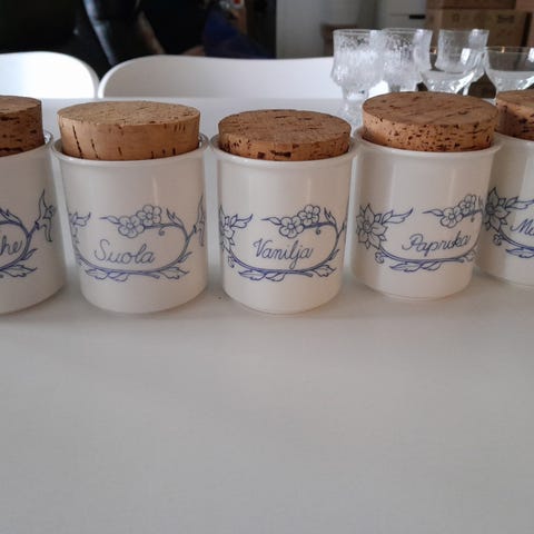 Arabia maustepurkit, valmistettu keramiikasta, joissa korkkikannet. Sarja sisältää useita purkkeja, joissa on sinisellä kirjoitettuja maustetekstejä. Purkit soveltuvat mausteiden säilytykseen keittiössä.Myynnissä vielä purkit: Kaneli,