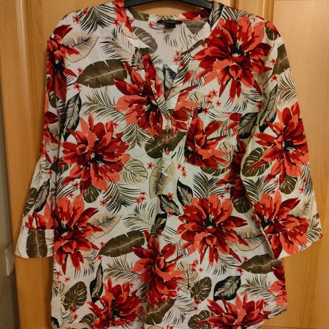 Myydään käyttämätön kotirouva pellava pusero 3/4 osa hihoilla. Hihat saa käärittyä ylös ja kiinnitettyä napeilla. Koko onesize, sopii hyvin kokoa 46 käyttävälle.