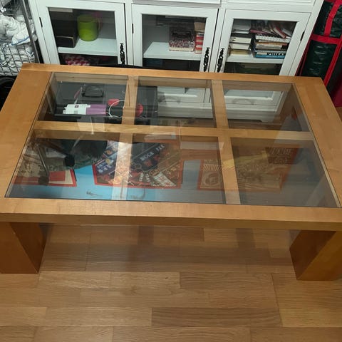 iso puinen olohuoneen pöytä, johon kuuluu lasilevy. saa tarjota.