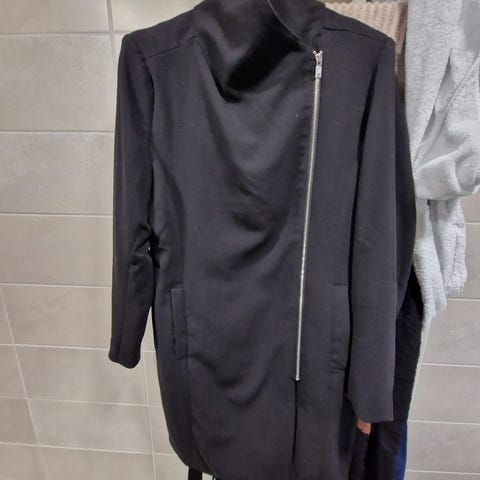 Seppälä Woman musta puolipitkä takki, naisten koko 44. Takki on tyylikäs, hieman vartaloa myötäilevä malli, sopii moniin sääolosuhteisiin. Syksyyn sopiva tiivis materiaali. Kangas himmeäkiiltoinen, takana ja edessä toisella puolen koristekuvio. Mukana vyö, hihoissa tampit ja muutenkin kivoja yksityiskohtia. Materiaali ja vuori näkyvät kuvissa, takissa on napitus edessä, voi kylmällä ilmalla napittaa ylös asti. Takki soveltuu arkikäyttöön ja viileämmille säille.