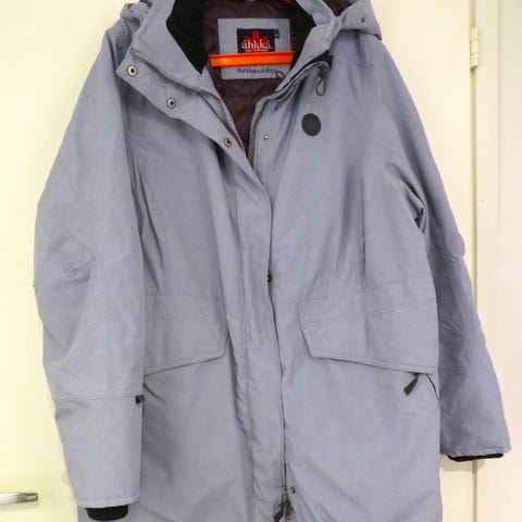 Elloksen musta pitkähkö naisten vuorillinen parkatakki, koko 46. Takissa on vetoketju ja painonapit edessä, sekä kiristysnyörit vyötäröllä ja irrotettavassa hupussa. Läpälliset taskut. Materiaali on kevyttä mutta tiivistä; sopiva välikausitakki monenlaiseen säähän.