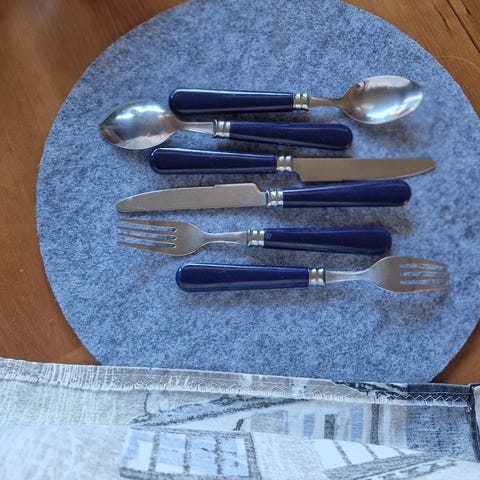 Veitsiä, haarukoita ja lusikoita 12 kpl jokaista. Pikkulusikoita on 7 kpl